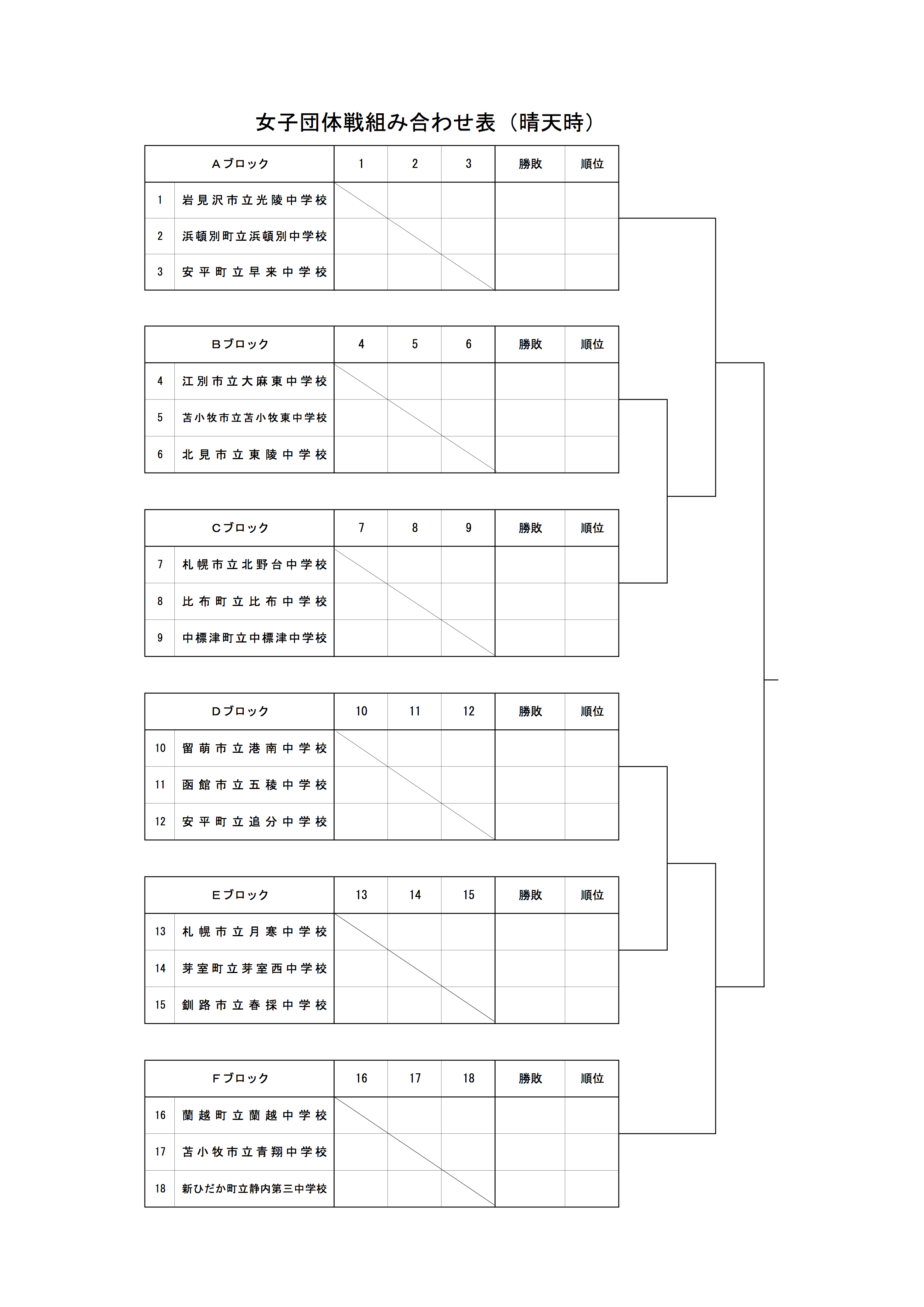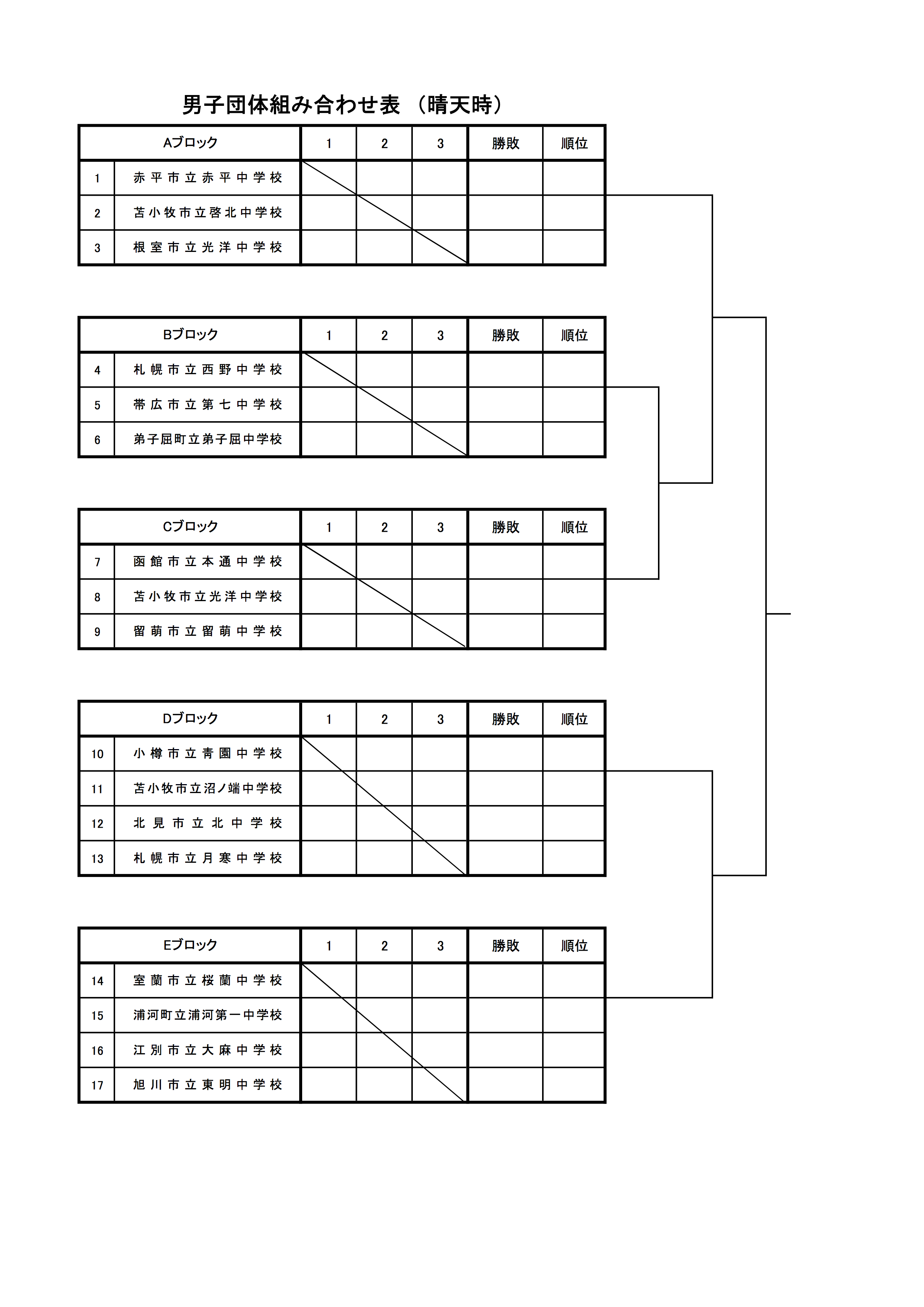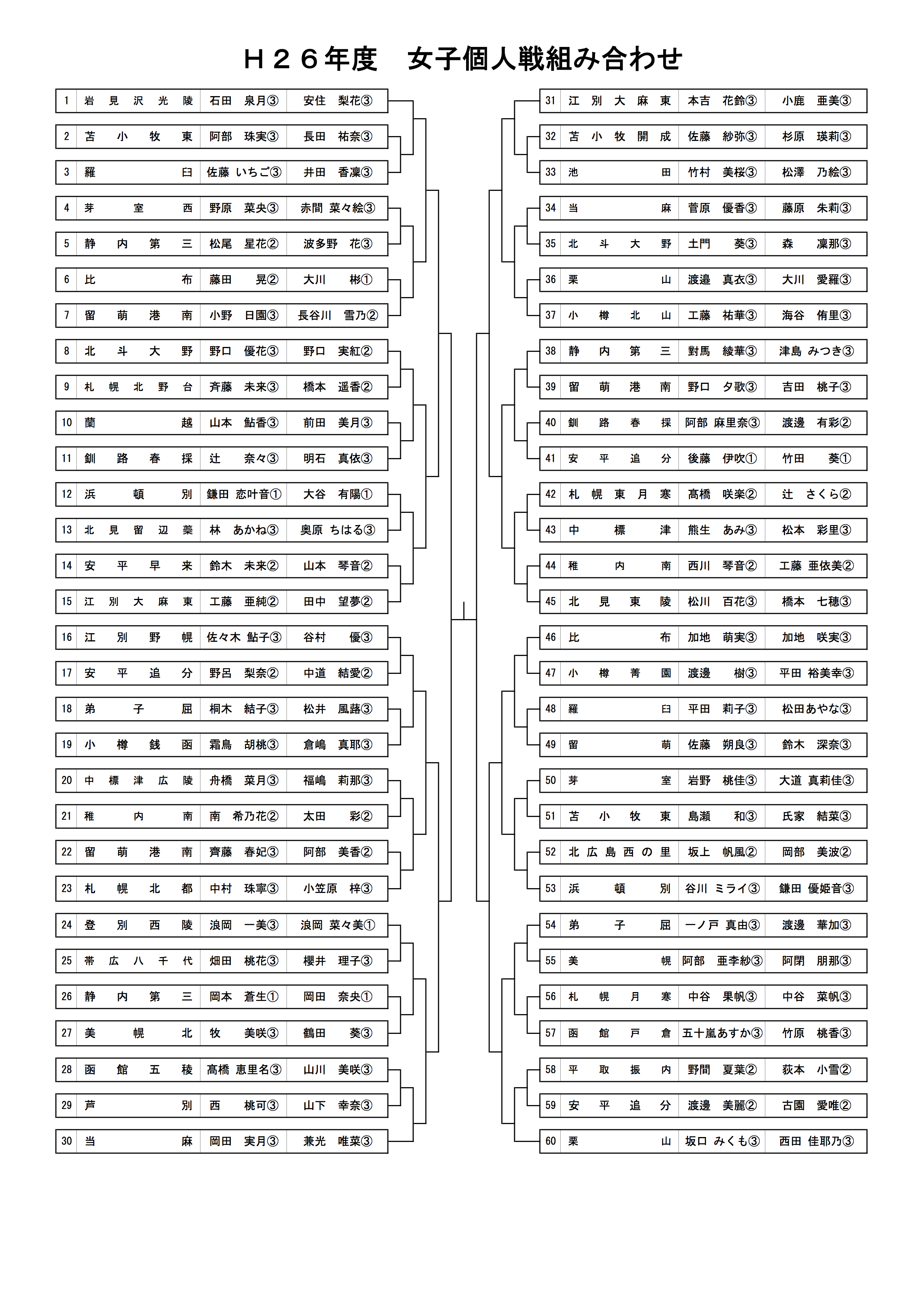 2014年7月23日 / 最終更新日時 : 2014年7月23日 管理人さん 第35回北海道中学校大会(中体連全道大会)組み合わせ 道連のホームページにアップされて、個人戦に間違いがあって下げられて… と、ちょっと時間がかかったようですが、ようやく組み合わせが発表になりました。 団体戦男子 団体戦女子 個人戦男子 個人戦女子 Facebook で共有 (新しいウィンドウで開きます) Facebook X で共有 (新しいウィンドウで開きます) X コメントを残す コメントをキャンセルメールアドレスが公開されることはありません。 ※ が付いている欄は必須項目ですコメント ※ 名前 ※ メール ※ サイト 上に表示された文字を入力してください。 新しいコメントをメールで通知 新しい投稿をメールで受け取る Δ